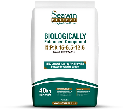 NPK General purpose fertilizer with Seaweed chelating extract Seawin’s biological enhanced compound N:P:K 15-6.5-12.5 is a combination of Nitrogen, Phosphorus, Potassium and Seawin’s Polysaccharides. These nutrients are in highly available forms to support crop health and yields.